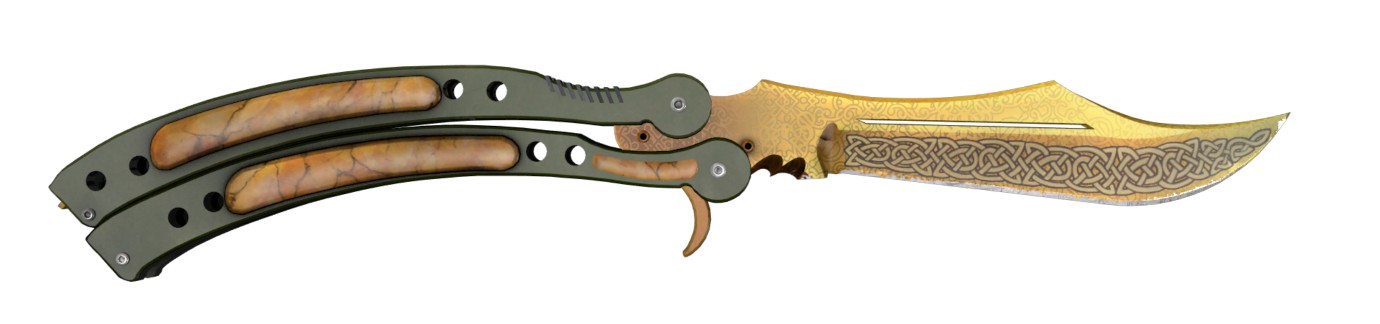 The CS gold knife is one of the most prestigious, recognizable skins. The blade is gold plated and engraved with ornaments. The combination of the gold blade and black handle adds contrast. This gold CS2 knife is only available through rare drops or expensive trades on the trading floors. Owning it promotes status and can be a cause for pride.